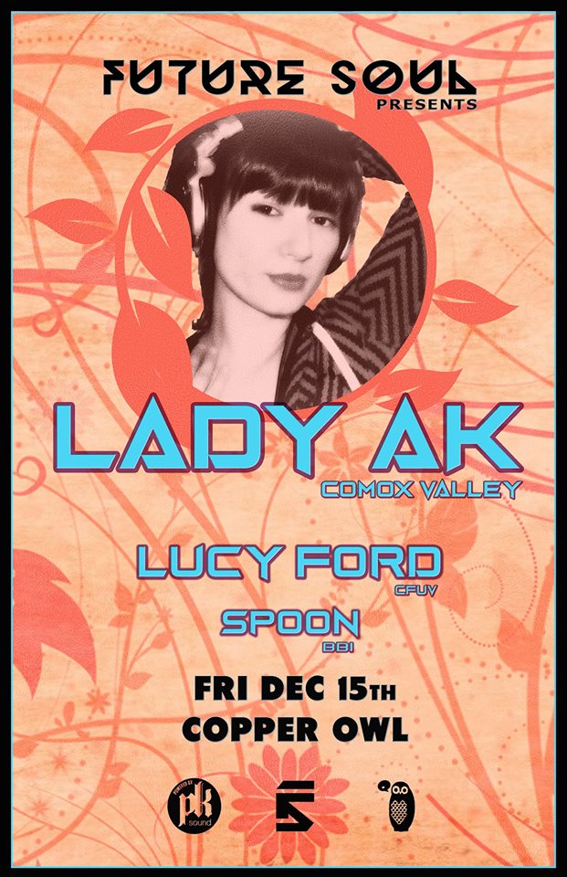 For our December show, we're bringing in one of the top female DJs in BC, LADY AK. Alla is a master of many styles, but of course, drum n' bass is what she'll deliver. We've brought back CFUV's LUCY FORD for the middle slot. If you saw her play at Future Soul last year, you'll know why. Starting the night off right will be a Victoria dnb staple and helluva nice guy, SPOON.