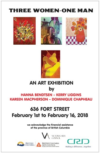 The Victoria Arts Council welcomes local artists, Hanna Bendtson, Kerry Liggins, Kareen MacPherson and Dominique Chapheau to our Fort Street Gallery in February 2018!
