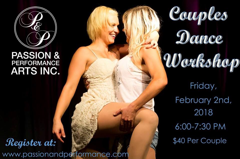Feel free to wear comfortable clothes and bring water. Passion and Performance is a safe space and all couples (over 19) are welcome to explore dance at our studio.