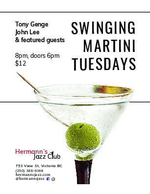 Hermann's Swinging Martini Tuesdays: Tony Genge, John Lee, Kelby McNayr @ Hermann's Jazz Club Feb 27 2018 - Feb 7th @ Hermann's Jazz Club
