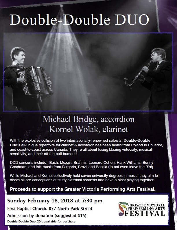 Double-Double Duo features Michael Bridge on accordion and Kornel Wolak on clarinet. This unique duo will be performing a fundraising concert for the Greater Victoria Performing Arts Festival. DDD concerts include: Bach, Mozart, Brahms, Leonard Cohen, Hank Williams, Benny Goodman, and folk music from Bulgaria, Brazil and Bosnia.