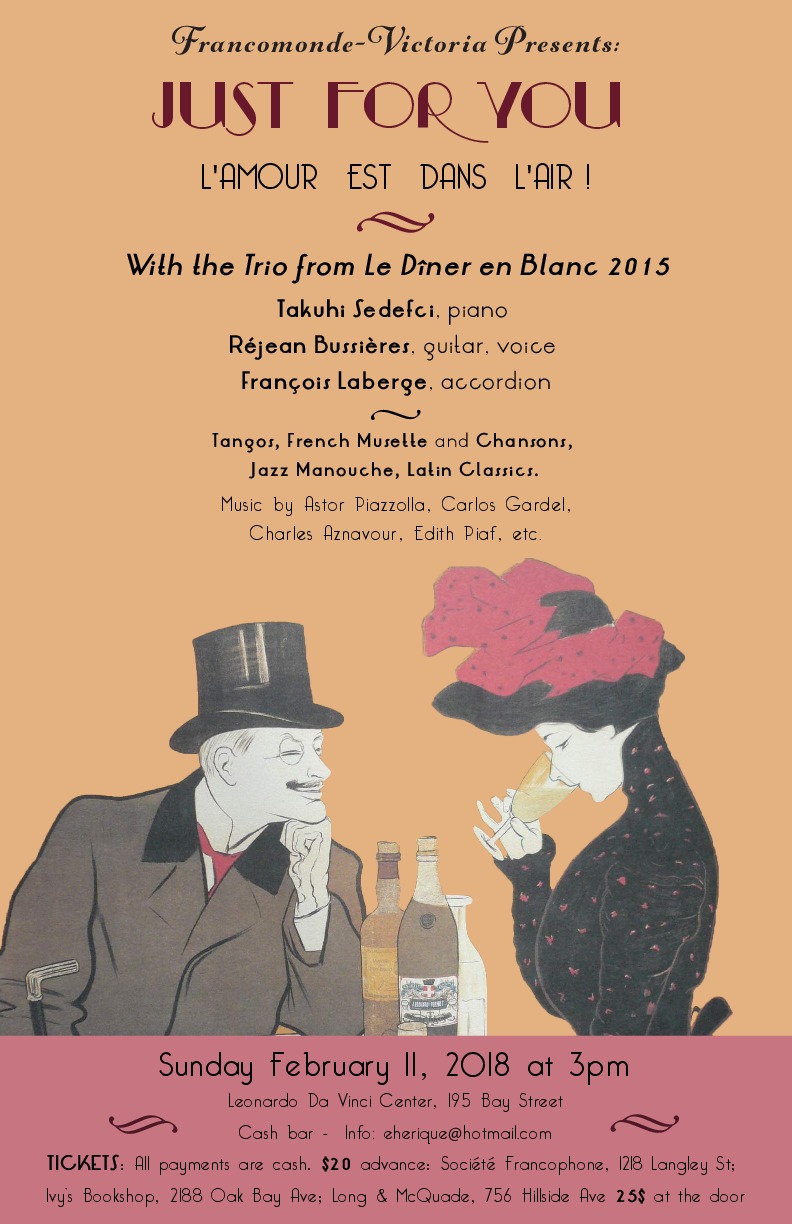 A Valentine’s concert/dance with Latin and French music. Cash bar. Presented by Francomonde-Victoria. With the trio of Dîner en Blanc Victoria 2015.