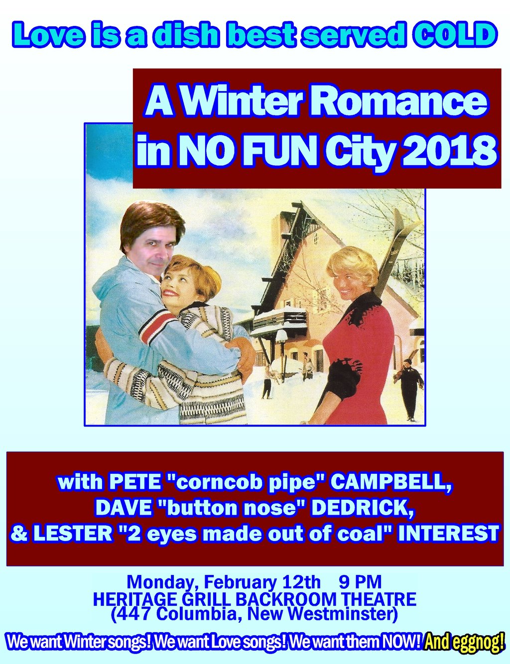 So parka your ass and enjoy Winter songs, Love songs, New songs, Old songs, Older songs, Even Older Still songs, Wicked-Old songs, Whoa-Hey-They're-Not-THAT-Old songs, and Fresher Than Springtime songs with the debonair lads who will teach you everything there is to know about Love in Wintertime...except why!