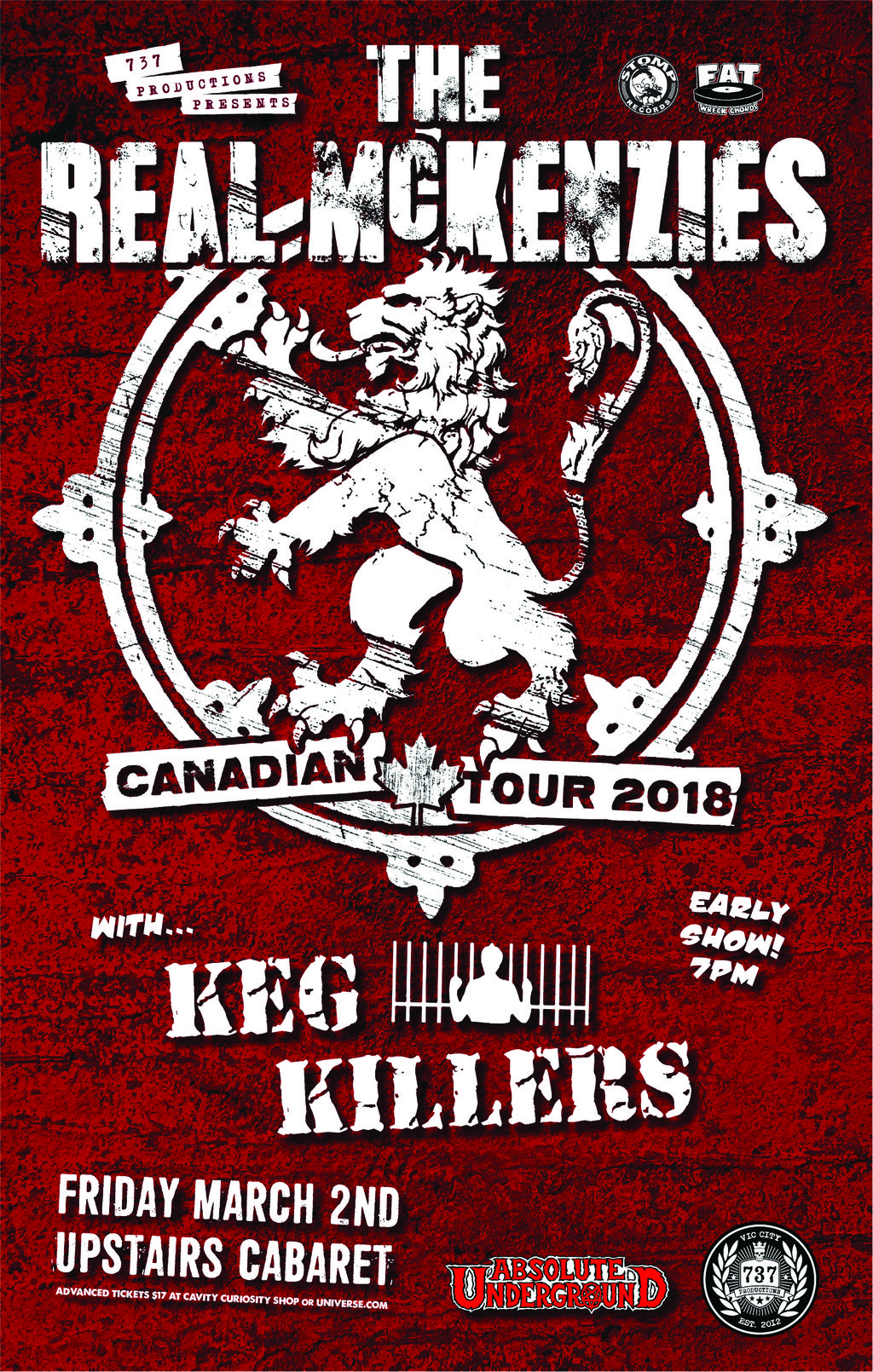737 Productions is very proud to present the annual return of the Real McKenzies. Last year the band celebrated their 25th Anniversary in style, touring not only the USA and Canada but also putting out a phenomenal new album, Two Devils Talk. Oh yeah and somewhere in 2018 they also found time to go on not 1, not 2, but 3 European tours!!! If for some reason you are unfamiliar with the Real McKenzies, not is fine, they are very opening and accepting of new people. They play music in the vein of Dropkick Murphys, and the Mahones to name a couple. Except they put a Scottish twist on it.