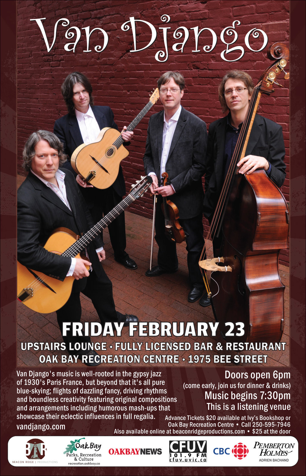 Advance tickets $20 at Ivy's Bookshop, the Oak Bay Recreation Centre reception and online at www.beaconridgeproductions.com