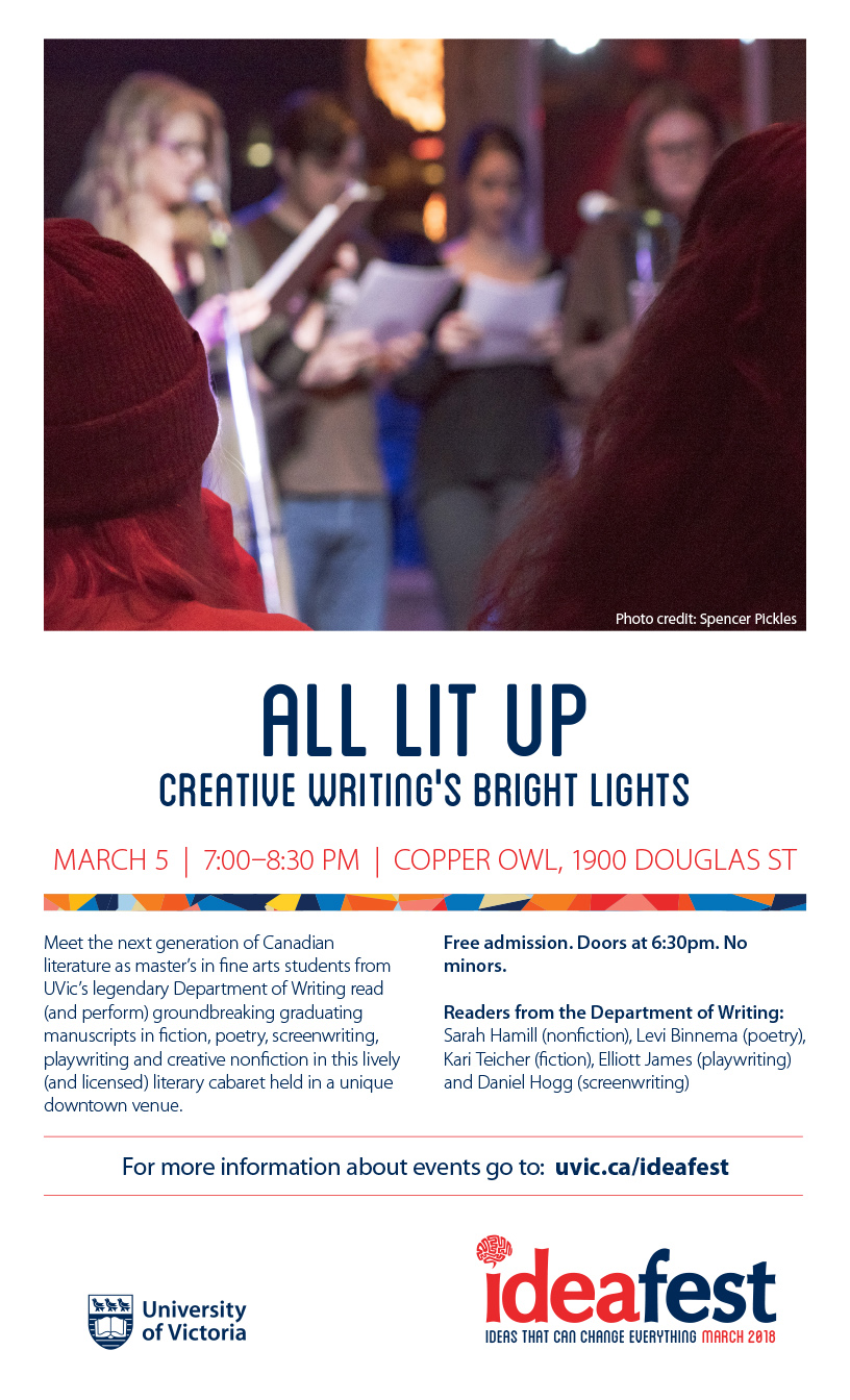 Meet the next generation of Canadian literature as master’s in fine arts students from UVic’s legendary Department of Writing read (and perform) groundbreaking graduating manuscripts in fiction, poetry, screenwriting, playwriting and creative non-fiction in this lively (and licensed) literary cabaret held in a unique downtown venue.