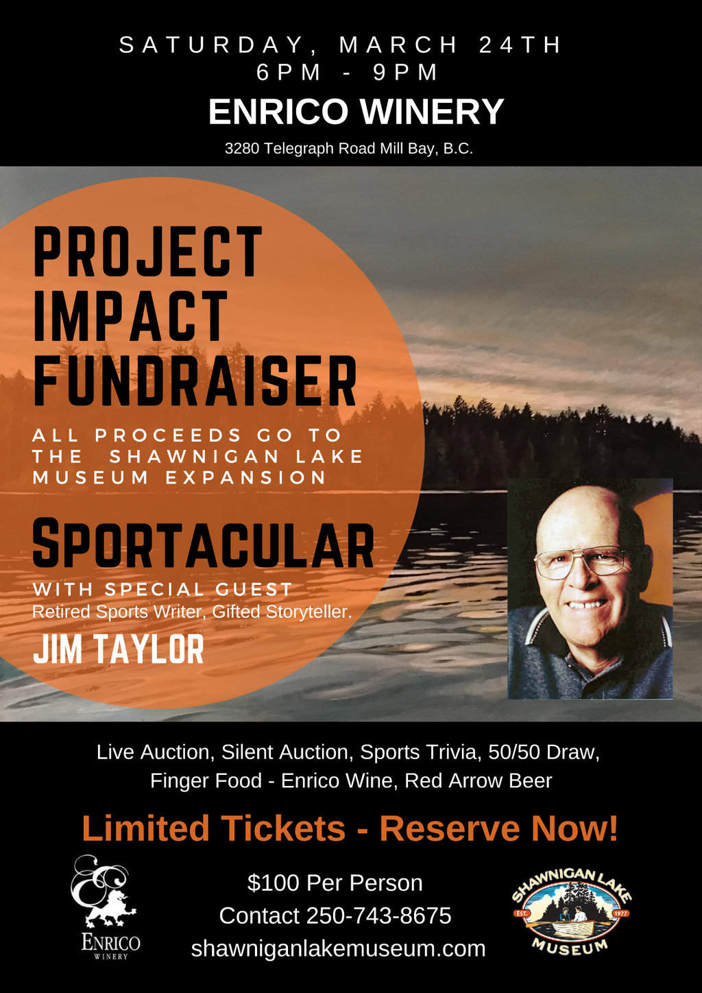 The Shawnigan Lake Historical Society invites residents, community and business leaders to the first major fund raiser for Project Impact- the expansion of the Shawnigan Lake Museum. This Sportacular event will take place at the beautiful Enrico Winery at 3280 Telegraph Rd, Mill Bay, BC, on March 241h, 2018, from 6:00PM- 9:00