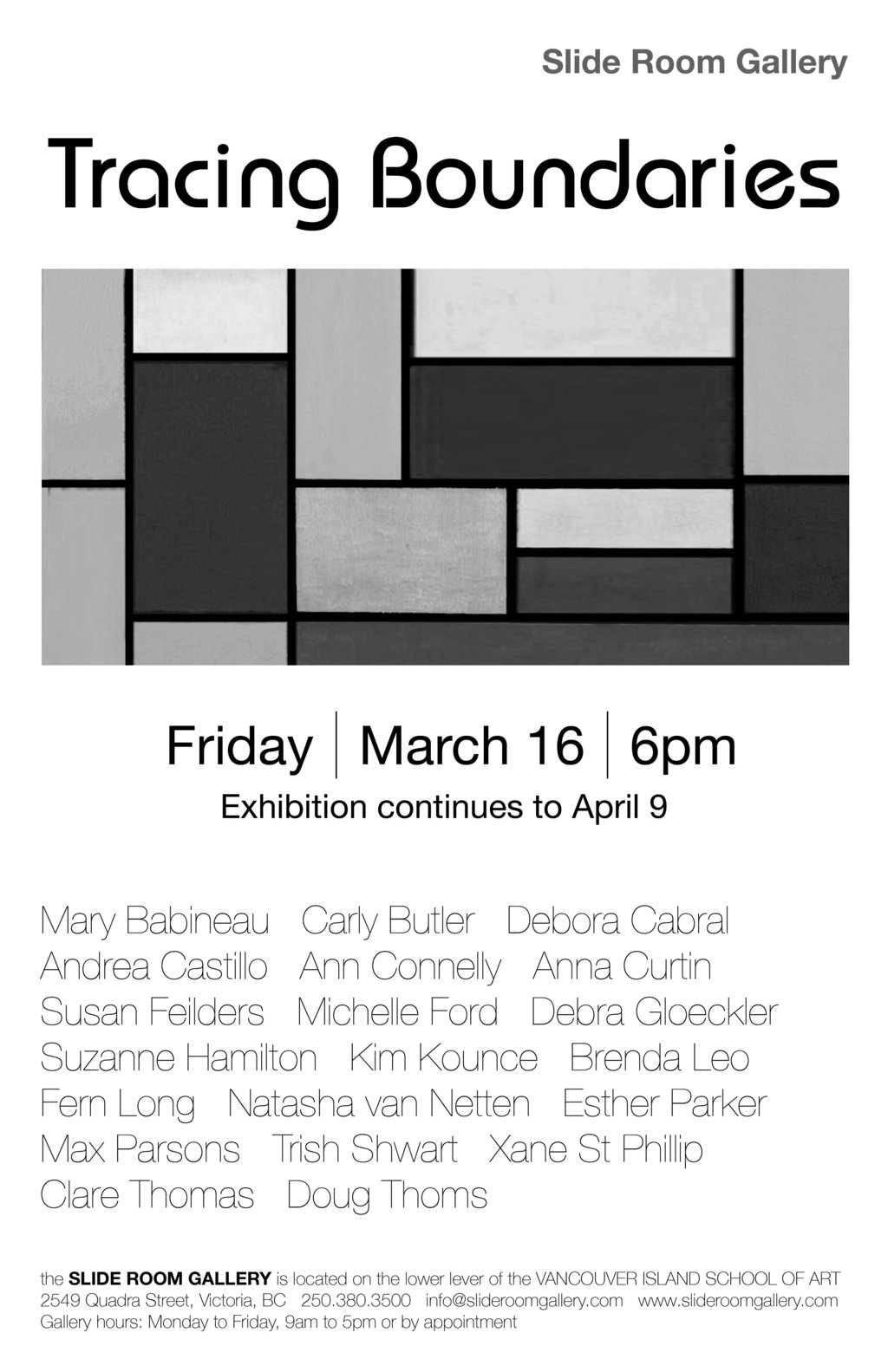 Tracing Boundaries: Mary Babineau, Carly Butler, Debora Cabral, Andrea Castillo, Ann Connelly, Anna B Grant, Susan Feilders, Michelle Ford, Debra Gloeckler, Suzanne Hamilton, Kim Kounce, Brenda Leo, Fern Long, Natasha van Netten, Esther Parker, Max Parsons, Max Parsons, Trish Shwart, Xane St Phillip, Clare Thomas, Doug Thoms