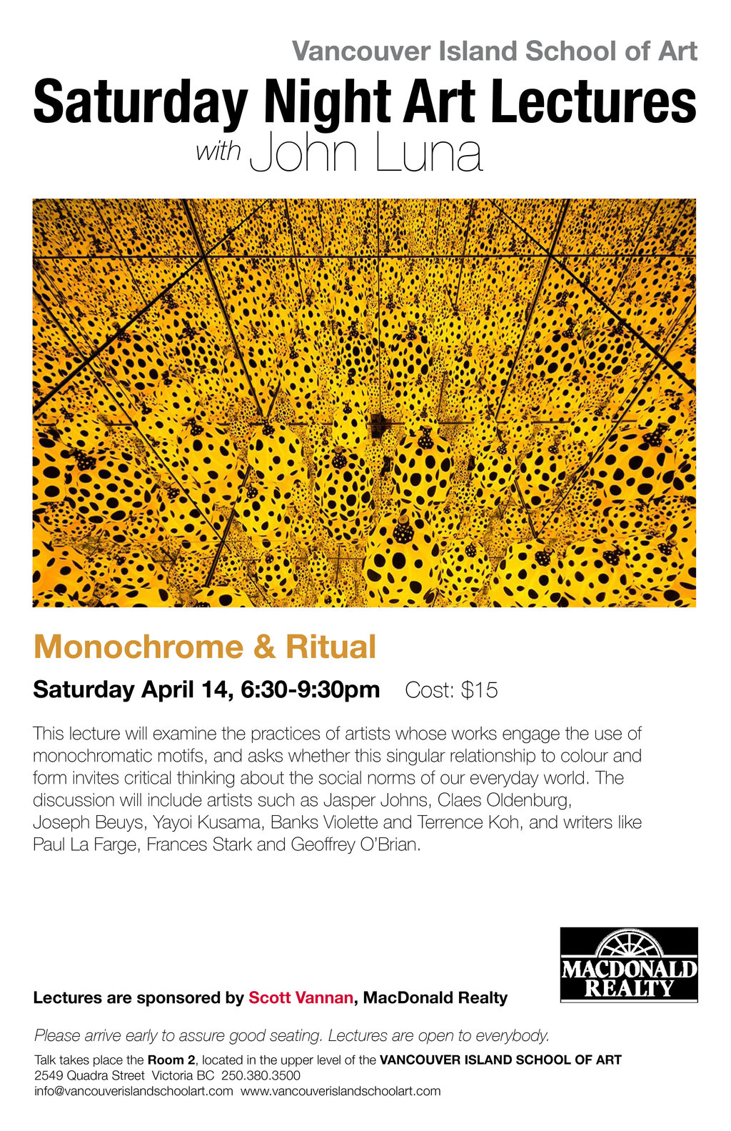 Saturday Night Art Lecture: Monochrome & Ritual: John Luna @ Vancouver Island School of Art Apr 14 2018 - Mar 24th @ Vancouver Island School of Art