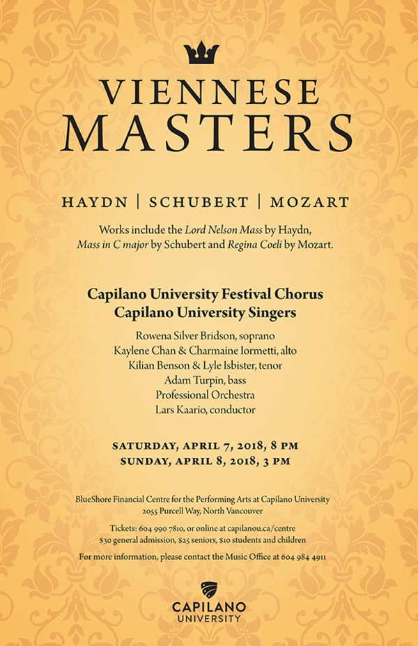 The Choirs of Capilano University, soloists and professional orchestra with concertmaster Nancy DiNovo, all led by director Lars Kaario, present Mozart's Regina Coeli, Schubert's Mass in C major, Haydn's Lord Nelson Mass.