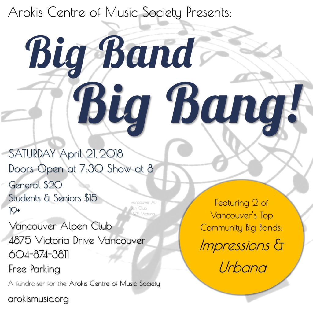 We’re excited to announce that Big Band Big Bang! is back for 2018, featuring both of the AROKIS big bands at a new location, the Vancouver Alpen Club.