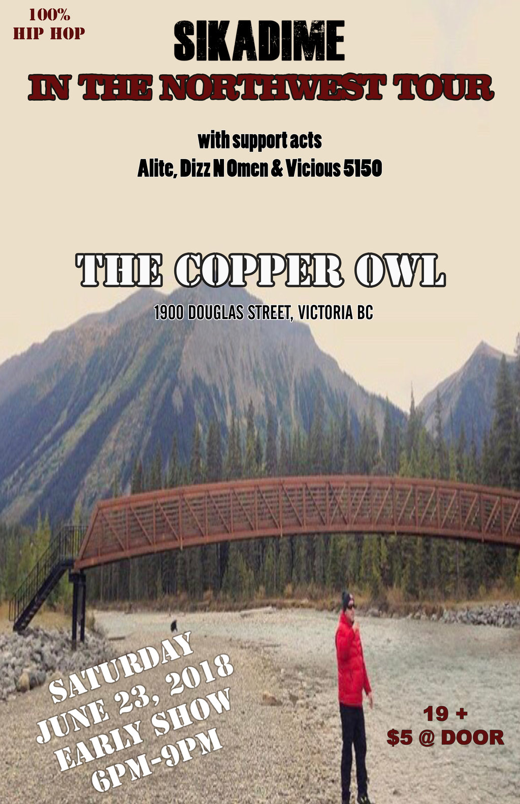 Originally from Victoria, Vancouver award winning hip hop artist & producer Sikadime embarks on his latest tour in support of the new album "The Wooden Spiral Staircase in a Glass House" making a stop at The Copper Owl for an early show.