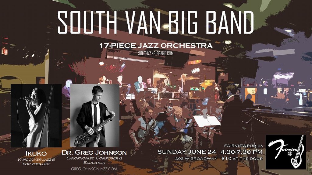 There'll be a lot of jazz around town during the Vancouver International Jazz Festival but where else are you gonna find a three-set show with a 17-piece big band! Kick back with the South Van Big Band at the Fairview Pub Vancouver, performing a mix of swing, latin and !unk! We're looking forward to performing some modern big band vocals with special guest Vancouver pop & jazz vocalist Ikuko and some original big band compositions and arrangements by special guest saxophonist, composer and educator Dr. Greg Johnson from California!