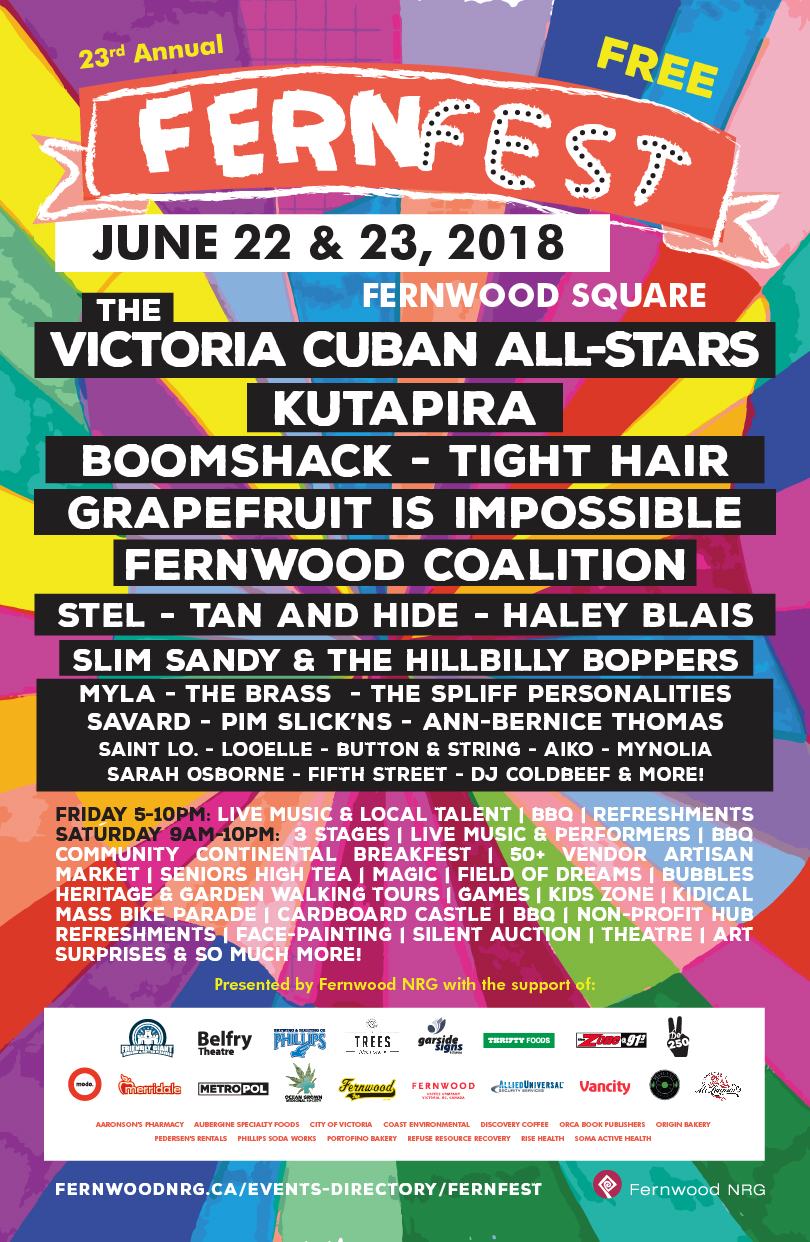 FernFest 2018: Kutapira, The Victoria Cuban All-Stars, Tight Hair, Boomshack, Grapefruit is Impossible, Stel, The Fernwood Coalition, Tan and Hide, MYLA, Slim Sandy and the Hillbilly Boppers, Haley Blais , The Spliff Personalities, Savard, Pim Slick'ns, Vic High R&B Band, Brass, Fifth Street