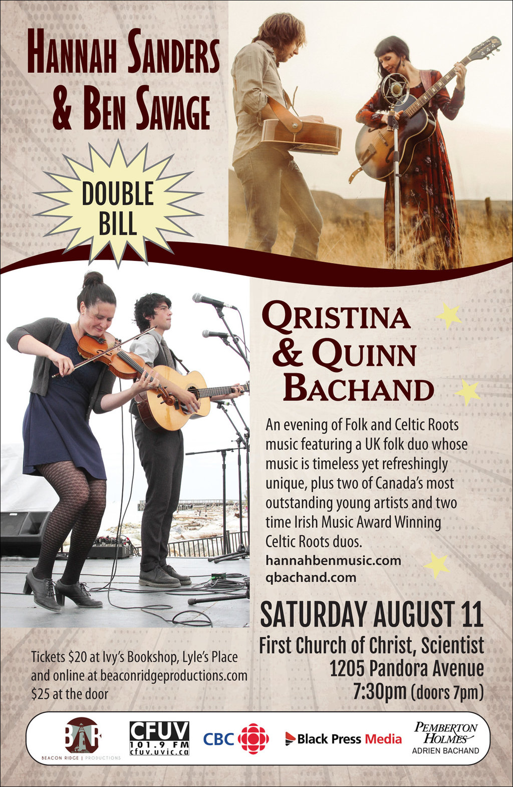 Undoubtedly two of the most outstanding young musicians to emerge from Canada's West Coast, Qristina and Quinn have a musical bond that only siblings can share. With a musical connection reminiscent of other Canadian family groups such as Leahy, The Barra MacNeils and The Rankins, audiences everywhere are quickly falling in love with this powerhouse duo. - www.qbachand.com