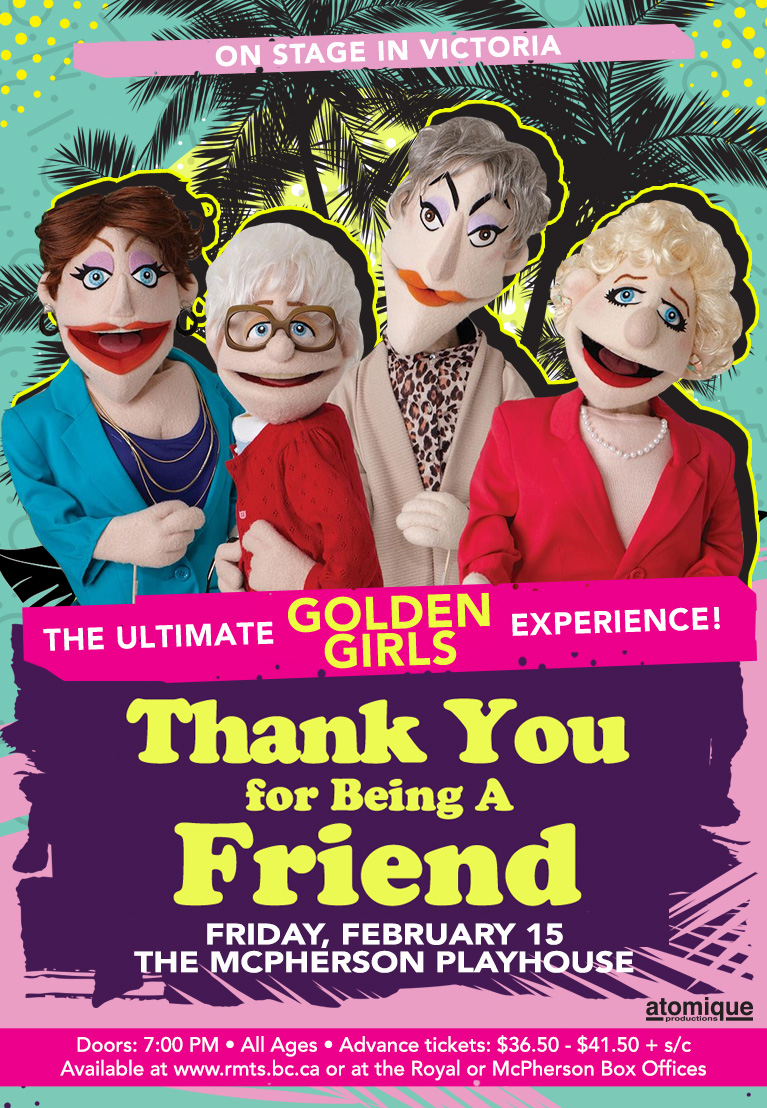 Prepare for an evening of laughter, spectacular put-downs and familiar friends as Miami's four favourite Golden Girls - Dorothy, Sophia, Rose and Blanche - reunite in puppet-form for this lovingly hilarious live tribute show. 'Thank You For Being A Friend' is the ultimate Golden Girls experience, delivering all the classic dialogue, razor sharp gags and taboo-breaking stories you'd expect. As a wonderful introduction to the joy of the hit television series for first timers, it'll have the uninitiated rolling in the aisles, while die-hard fans fondly remember the brilliance of The Golden Girls.