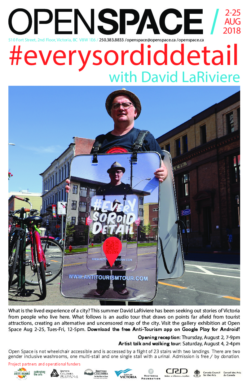 What is the lived experience of a city? This summer David LaRiviere has been seeking out stories of Victoria from people who live here. What follows is an audio tour that draws on points far afield from tourist attractions, creating an alternative and uncensored map of the city. Visit the gallery exhibition at Open Space Aug 2-25, Tues-Fri, 12-5pm. Download the free Anti-Tourism app on Google Play for Android!