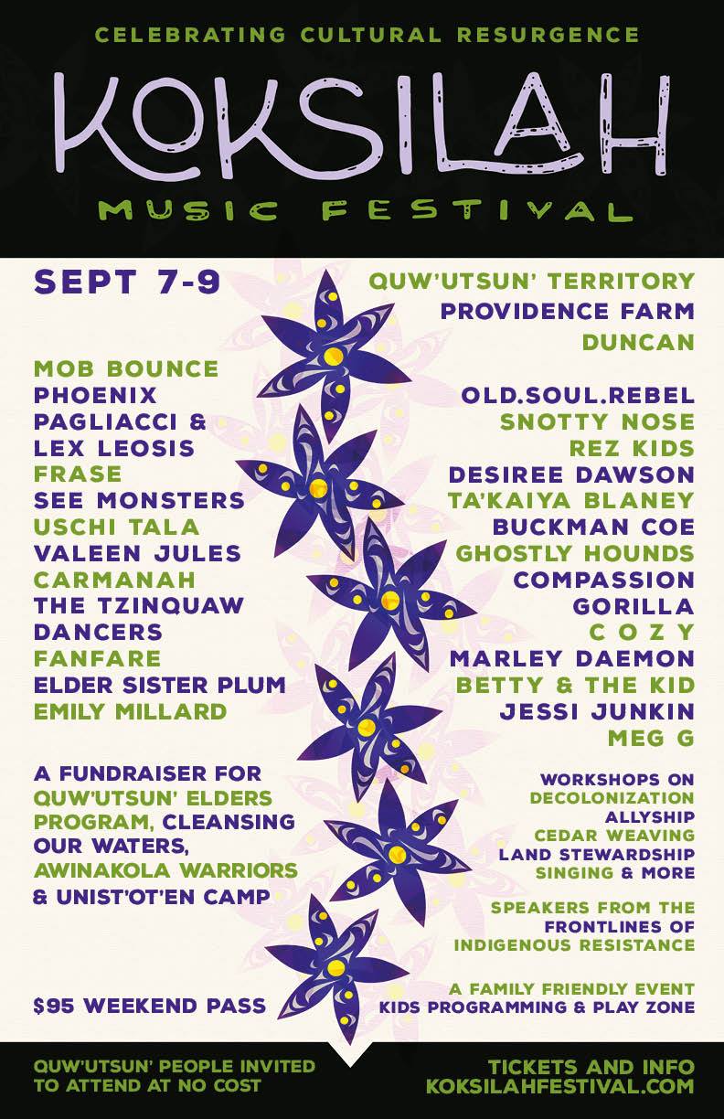 Koksilah Music Festival: Mob Bounce, Phoenix Pagliacci & Lex Leosis  (of The Sorority), FRASE, Snotty Nose Rez Kids, TA'KAIYA BLANEY, Old.Soul.Rebel , Desiree Dawson,  The See Monsters, Uschi Tala, Buckman Coe, Valeen Jules, Ghostly Hounds, Carmanah, Compassion Gorilla, The Tzinquaw Dancer, COZY, Fanfare, Marley Daemon, Elder Sister plum, Betty & The Kid, Emily Millard, jessi junkin, Meg G @ Providence Farm Sep 7 2018 - Feb 5th @ Providence Farm