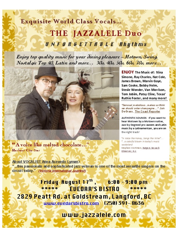 EXQUISITE World Class Vocals and Rhythms for your evening dining pleasure. The Award-winning Jazzalele Duo is Motown-born Jazzista, Anna Acevedo Lyman and Hot Bass by Steve "Swingman" Sutton. AUTHENTIC SOUNDS: If you want to hear Motown by a Motown native, Jazz by Degreed pro Jazzers and Latin music by a Latinamerican, you'll have come to the right place. Invite your friends. Everywhere they appear, the phones go up! Enjoy a remarkable evening out that will be different from the rest! www.jazzalele.com