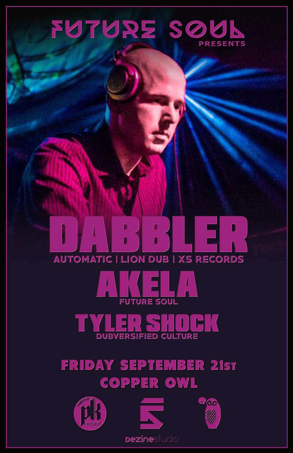 We're stoked to have west coast dnb royalty back again at Future Soul - the one and only DABBLER. This man was a leader in the Vancouver drum n' bass scene for years, but now makes the island his home. The big boss man, AKELA, fills the middle slot and Dubversified Culture's TYLER SHOCK is opening the night.