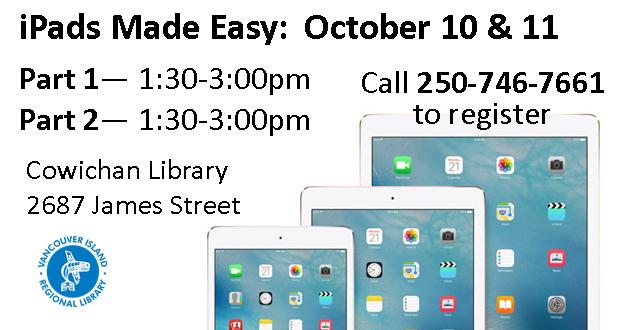 Call 250-746-7661 to register for this free, 2-part workshop on how to get the most out of your iPad (space is limited).