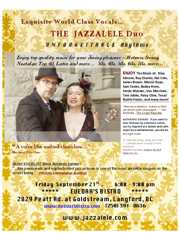 "A Voice like melted chocolate" "A Voice like honey, songs like wine" (EXQUISITE World Class Vocals and Rhythms for your evening dining pleasure. The Award-winning Jazzalele Duo is Motown-born Jazzista, Anna Acevedo Lyman and Hot Bass by Steve "Swingman" Sutton. AUTHENTIC SOUNDS: If you want to hear Motown by a Motown native, Jazz by Degreed pro Jazzers and Latin music by a Latinamerican, you'll have come to the right place. Invite your friends. Everywhere they appear, the phones go up! Enjoy a remarkable evening out that will be different from the rest! http://www.jazzalele.com LISTEN: https://www.youtube.com/watch?v=ERycPsQnipA