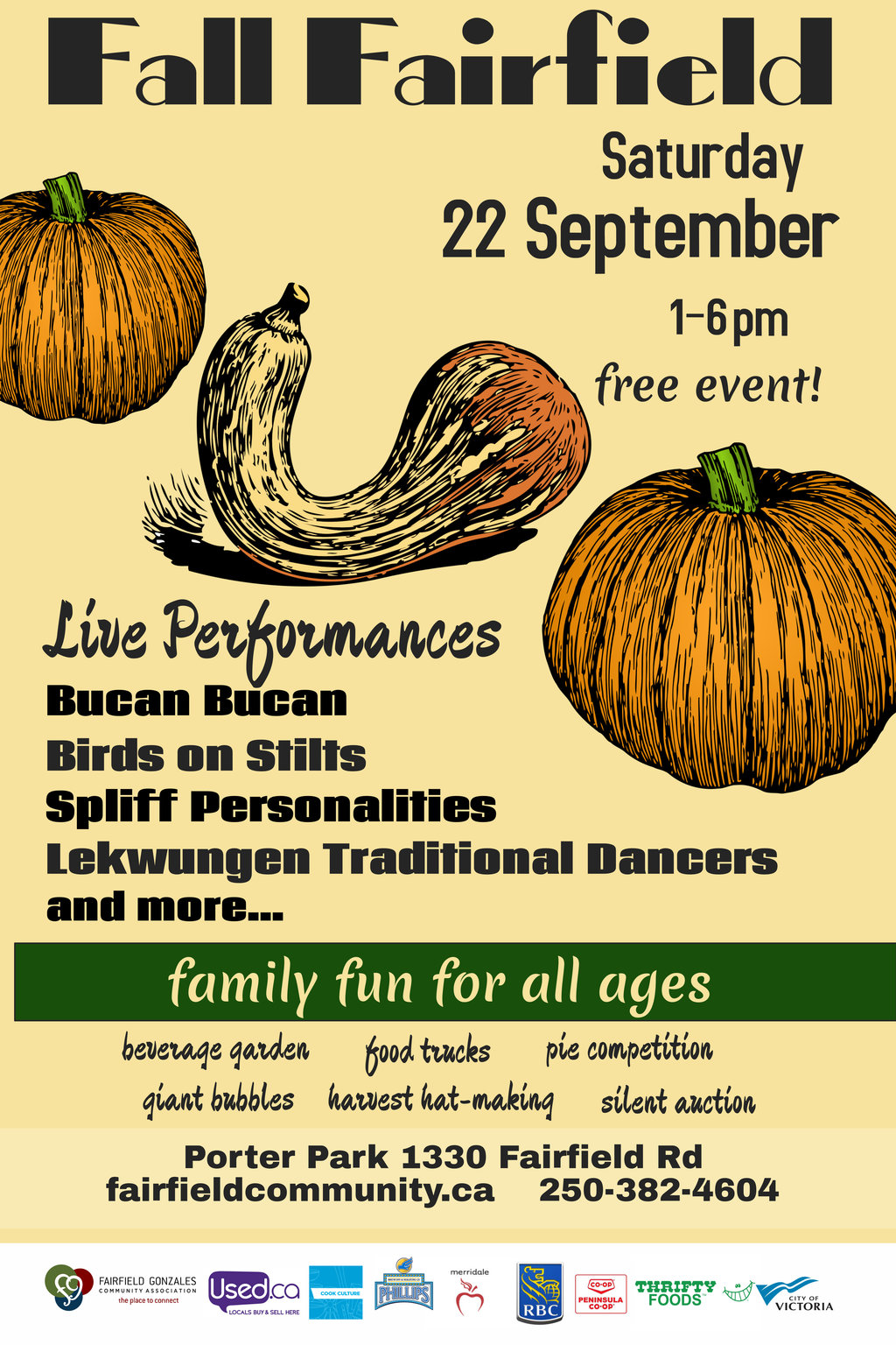 Presented by the Fairfield Gonzales Commmunity Association, Fall Fairfield is located in Porter Park (behind the community centre) from 1-6 pm Saturday September 22nd 2018.