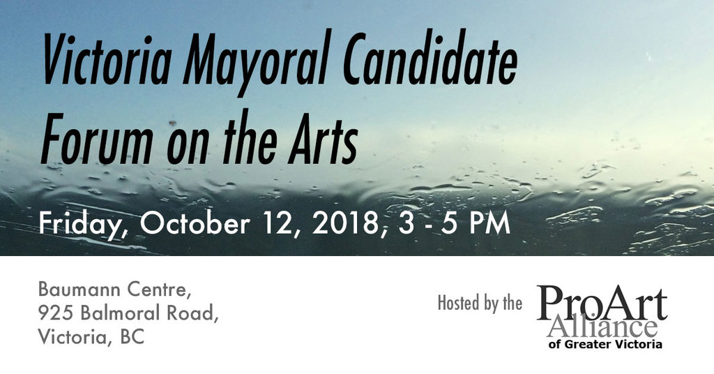 The ProArt Alliance of Greater Victoria will host a Victoria Mayoral Candidate Forum on the Arts on Friday, October 12, 2018, 3pm, at the Baumann Centre.