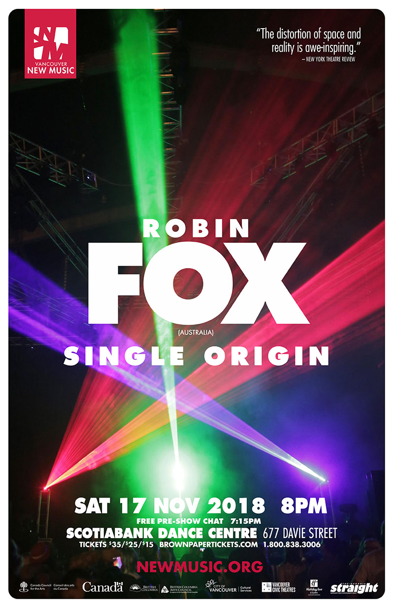 Robin Fox (Australia) returns to Vancouver with Single Origin, his new work for laser and sound that explores the possibilities of mechanically induced synaesthesia. Renowned for creating unique, expansive and intense sound worlds, Fox blends his split A/V personality with this one-of-a-kind concerto for a laser beam.
