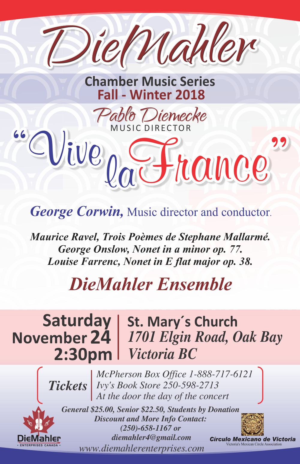 The DieMahler Ensemble, Pablo Diemecke Music Director, specializes in masterful musical artistry, vibrancy, character, and very deep feeling, leaving no musical path unexplored.Each concert in this beautiful series offers a different flavour of musical colours and textures, with varied repertoire, from virtuoso classical works to gorgeous light romantic works that explore the wide range of musical emotion and expression.