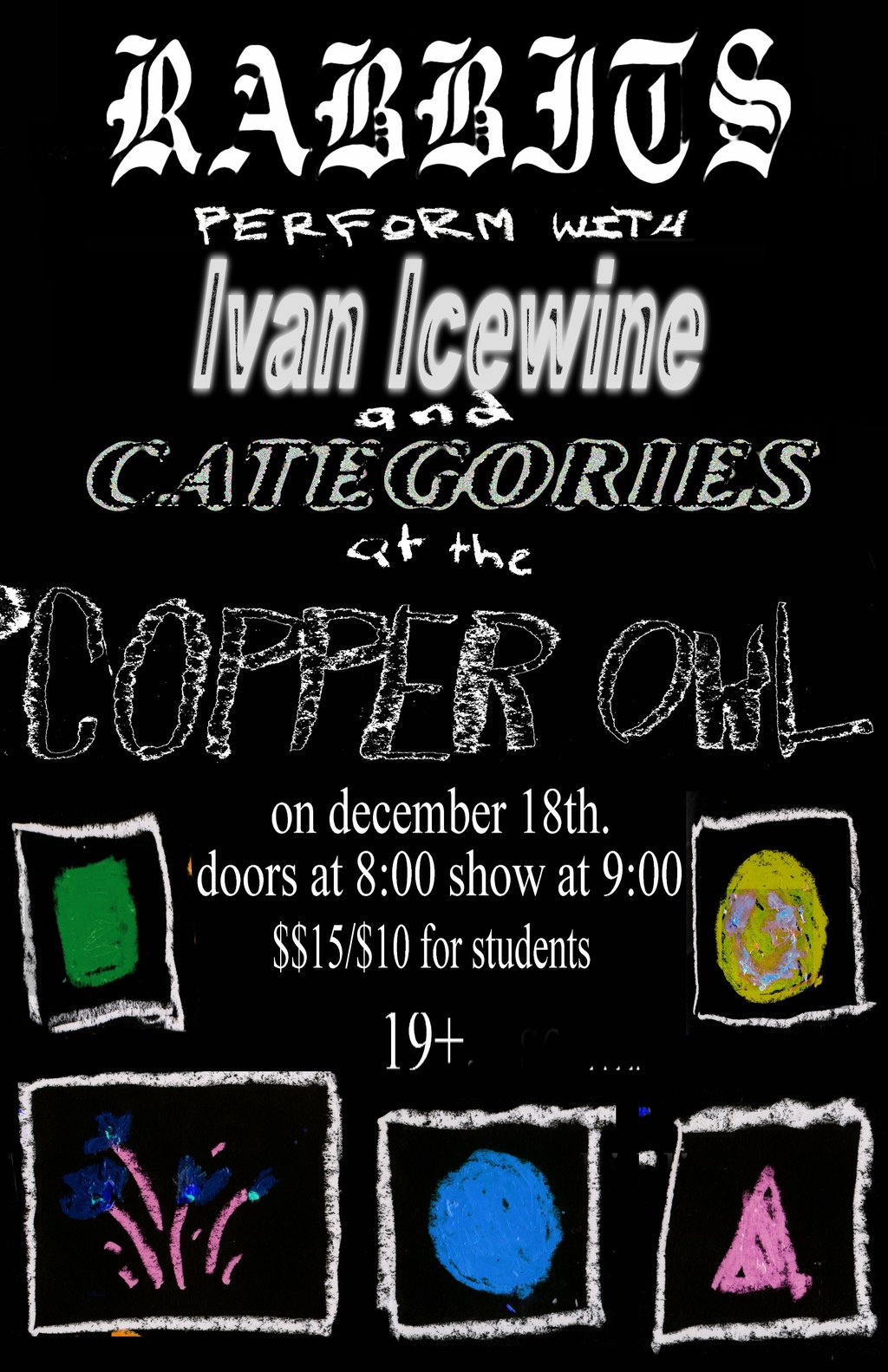 Ivan Icewine (Stanley Sarosiak) and Categories (Colt Hoey) make emo rap together. They will be joined on stage by members of Wept and Pastel Blank (Oliver Hollingshead and Dougie Bedell).