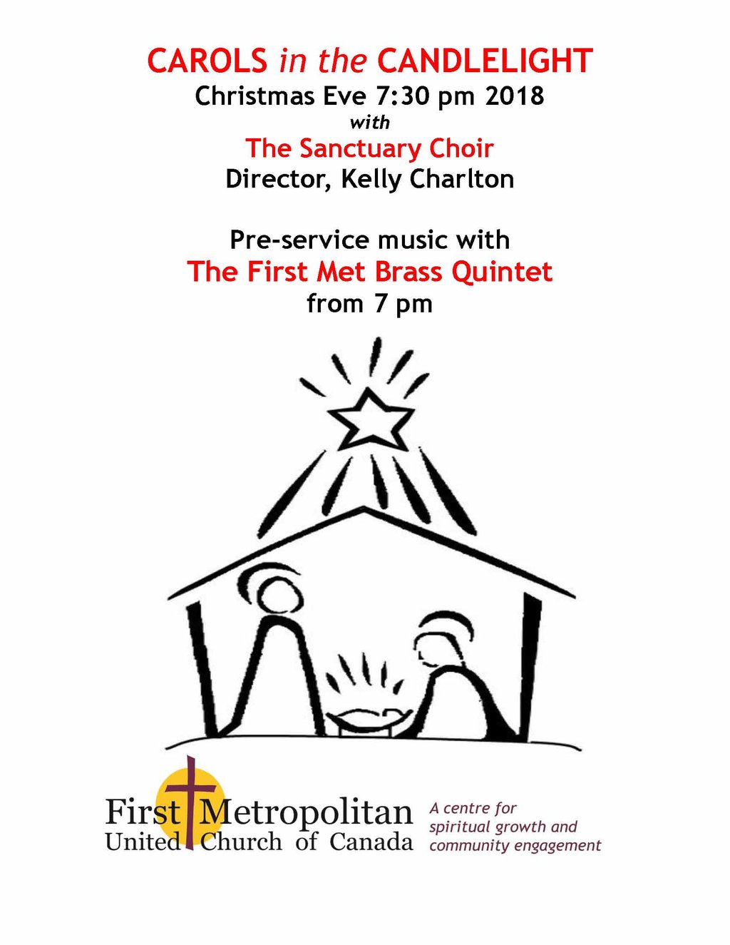 The choir and congregation of First-Metropolitan United Church will host a service of Carols in the Candlelight on Christmas Eve. Festive Welcome Music will begin at 7:00 with the First-Met Brass Quintet. The service begins at 7:30 and tells the Christmas story through traditional readings, familiar carols, and choral anthems, surrounded by the glowing warmth of candlelight.