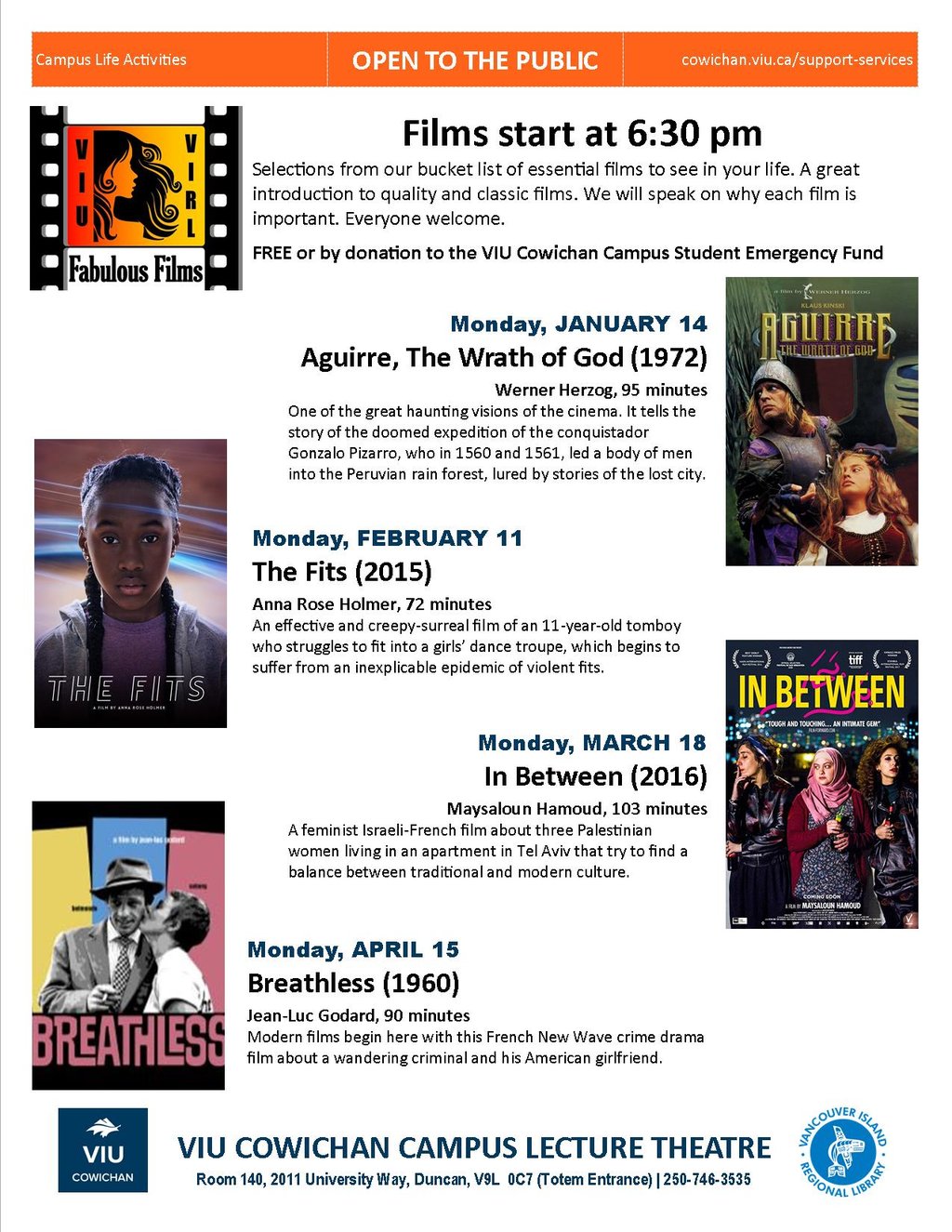 Fabulous Films are Open to the Public, and admission is free or by donation to the VIU Cowichan Student Emergency Fund.