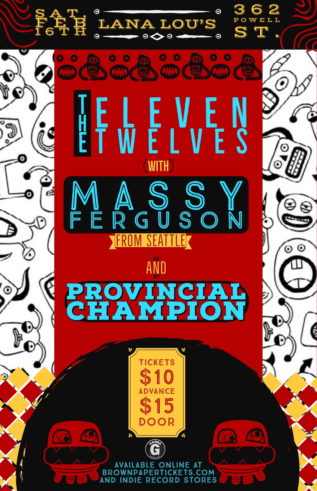 Vancouver's favourite 60s inspired garage band, The Eleven Twelves team up with Seattle rockers Massy Ferguson and alternative pop/punk duo Provincial Champion at LanaLou's Rock and Roll Eatery. There will be dancing good times and great friends.