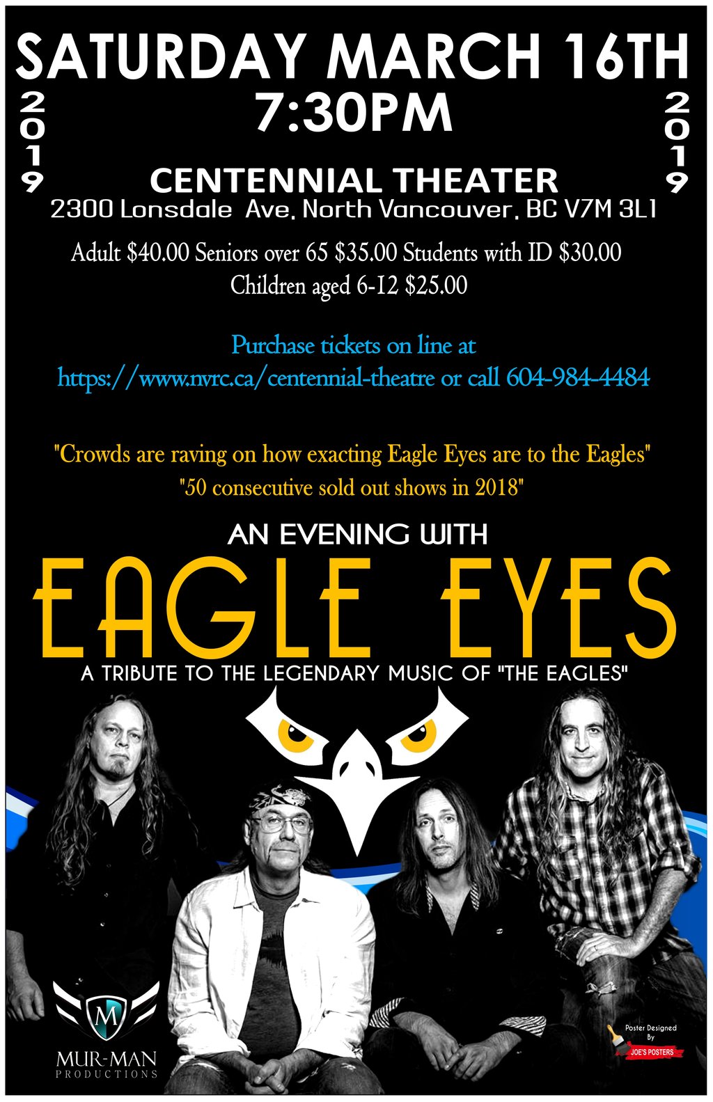 "An evening celebrating the music of the Eagles": Eagle Eyes @ Centennial Theatre Mar 16 2019 - Feb 6th @ Centennial Theatre