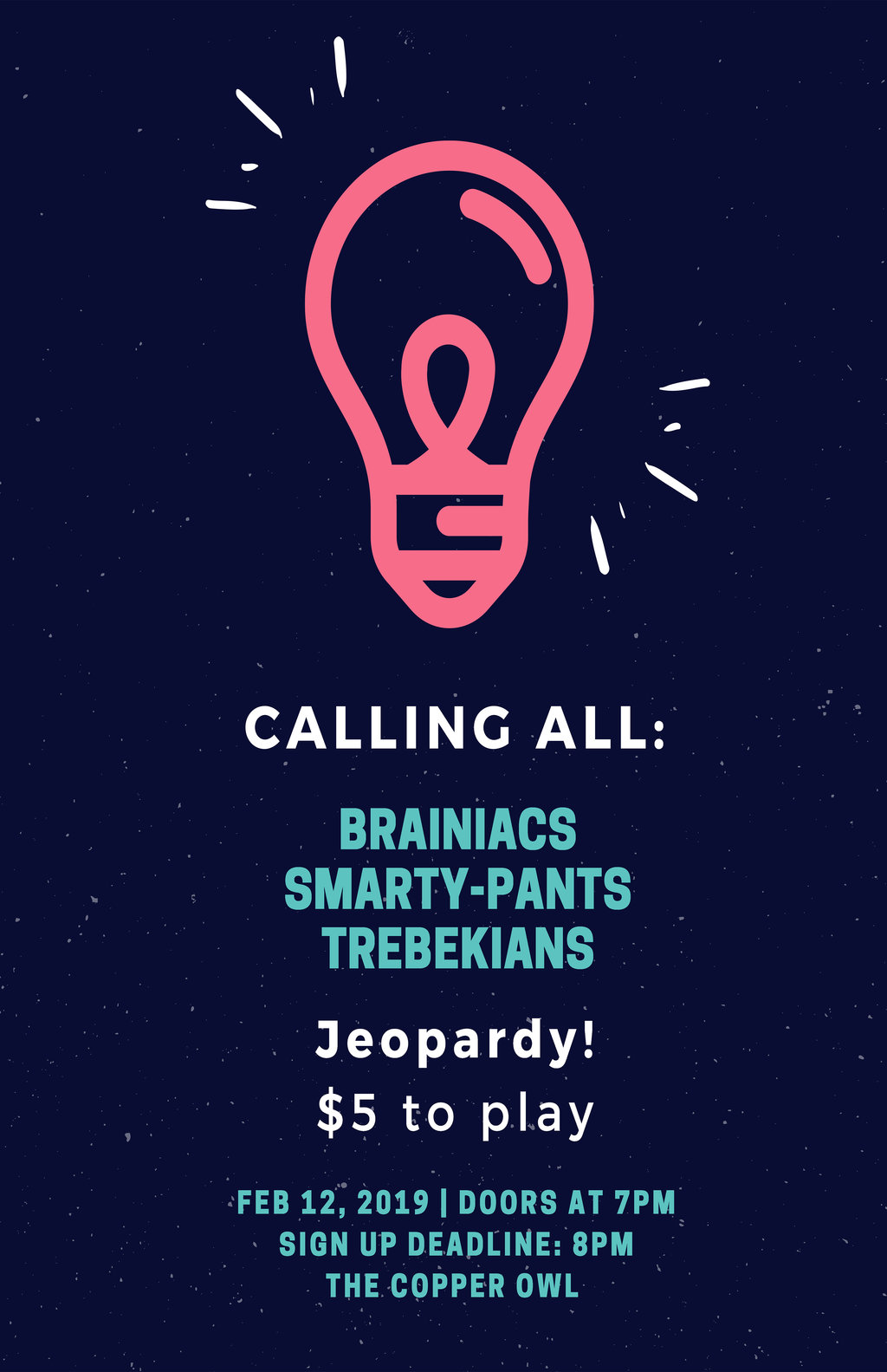Join us for a night of Jeopardy! at the Copper Owl! Entry: $5 Doors: 7pm De...