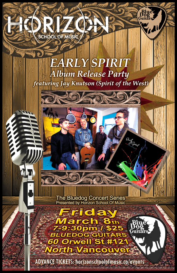 . Friday, March 8th Bluedog Concert Series presents EARLY SPIRIT Album Release Party (featuring Spirit of the West's Jay Knutson) @ Bluedog Guitars, #121 - 60 Orwell Street, North Vancouver / Show 7pm / Get your tickets @ https://www.horizonschoolofmusic.ca/events