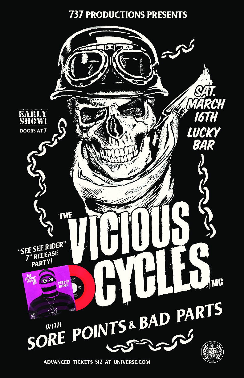 737 Productions proudly presents The Vicious Cycles MC 's Victoria release party for their new 7 inch record! The record is entitled See See Rider and is a collaborative effort between the band and See See Motor Coffee Co! If you have ever caught the Vicious Cycles live before you already know what kind of treat you are in for, and if you haven't, get ready to be overwhelmed by punk rock n' roll of the finest quality! Lots of motorcycle related themes and imagery involved too, but I am sure you already figured that out.