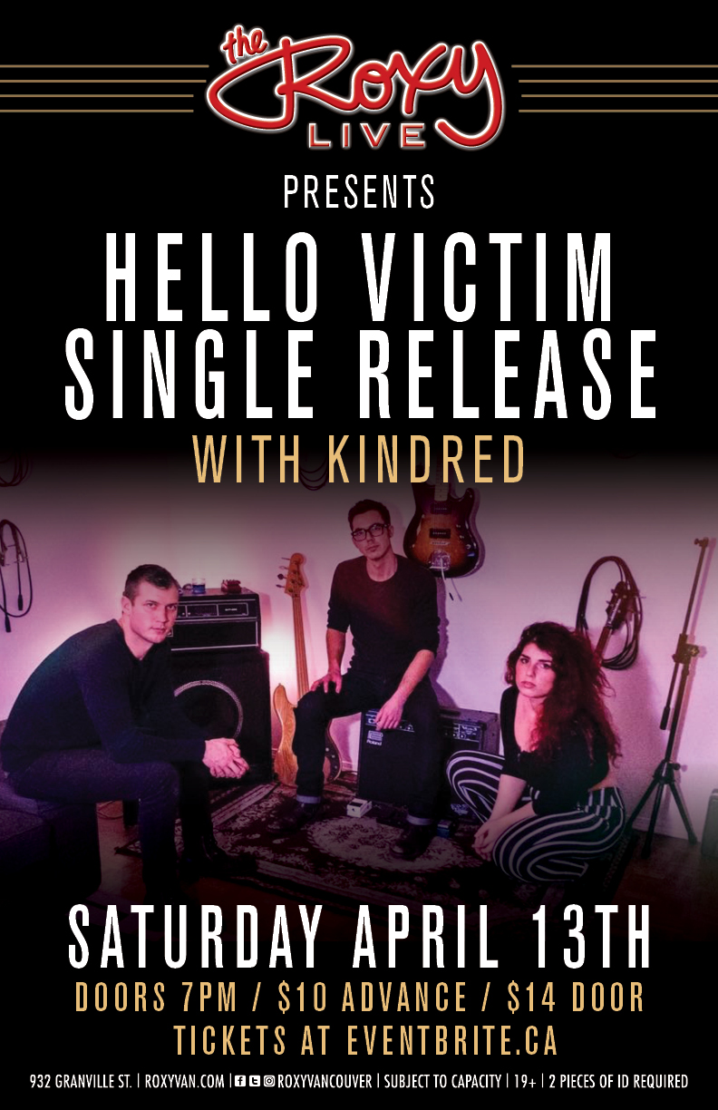 Hello Victim are an indie electropop three-piece hailing from Vancouver, BC. Gleaning muse from modern dance-pop and 80's synth, the band has focused on creating a palatable yet original, challenging, and iconic sound. Combining dark, moody lyrics with musical sensibilities rooted in groove that demands movement, Hello Victim have set out conquer personal and relatable adversity with honesty and dance.