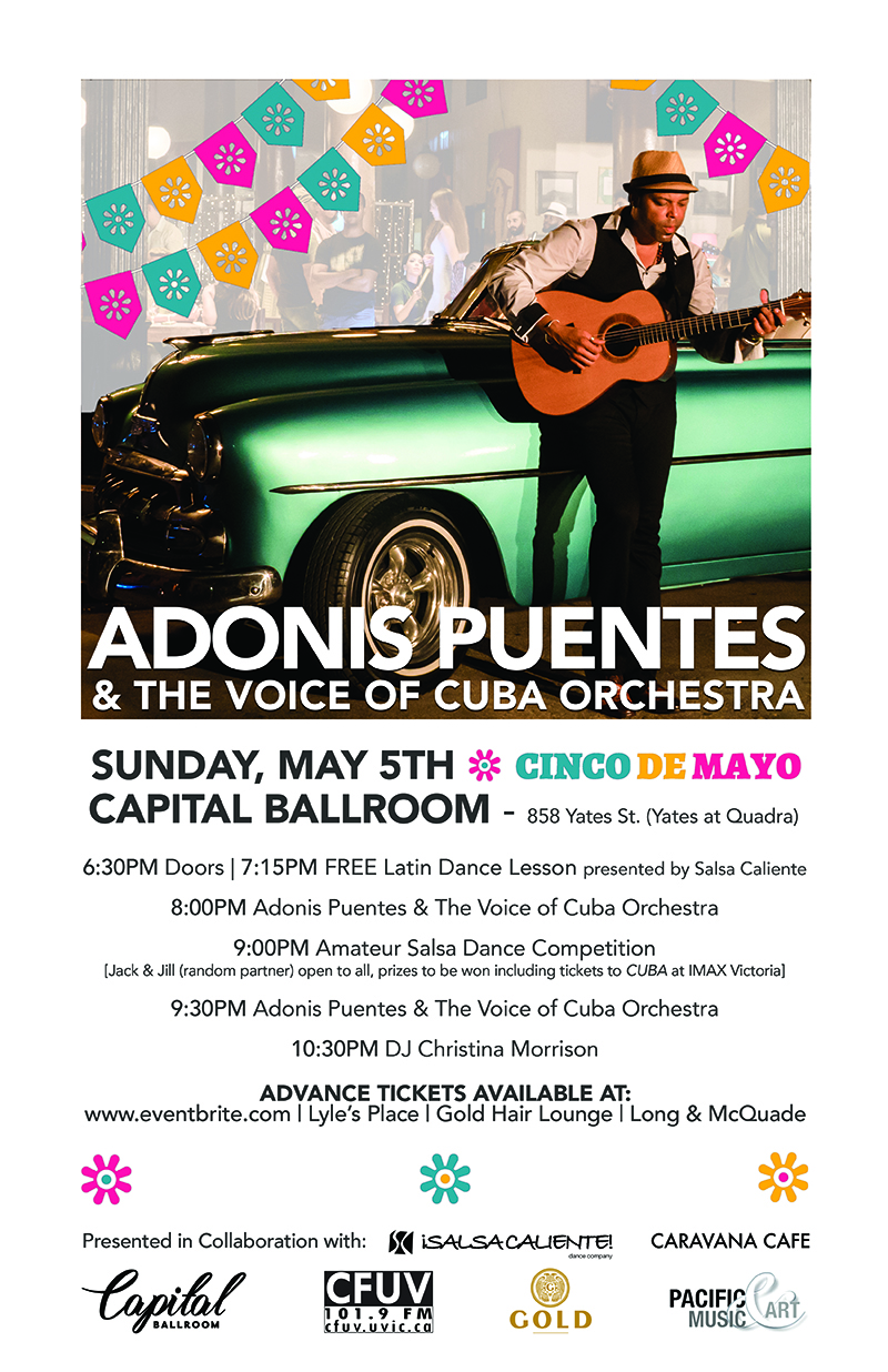 Join Adonis Puentes & The Voice of Cuba Orchestra to celebrate Cinco De Mayo in Victoria, BC. A night of live music, dance lessons & competition, and celebrations at the Capital Ballroom.