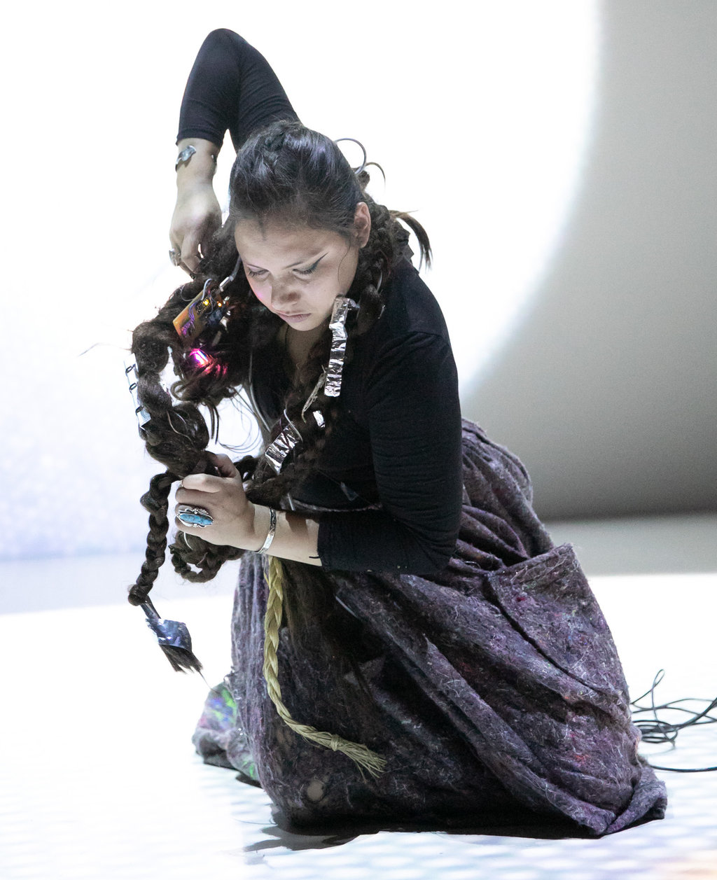 KITE aka Suzanne Kite is an Oglala Lakota performance artist, visual artist, and composer raised in Southern California, with a BFA from CalArts in music composition, an MFA from Bard College’s Milton Avery Graduate School, and is a PhD student at Concordia University and Research Assistant for the Initiative for Indigenous Futures. Her research is concerned with contemporary Lakota epistemologies through research-creation, computational media, and performance practice. Recently, Kite has been developing a body interface for movement performances, carbon fiber sculptures, immersive video & sound installations, as well as co-running the experimental electronic imprint, Unheard Records. On Sunday, May 19th, Suzanne will present “Anáwaǧoptaŋ éyaš tákuninawáȟʼuŋ šni. I listened but heard nothing” featuring live audio-visual performance using a hair-braid interface that Suzanne developed.