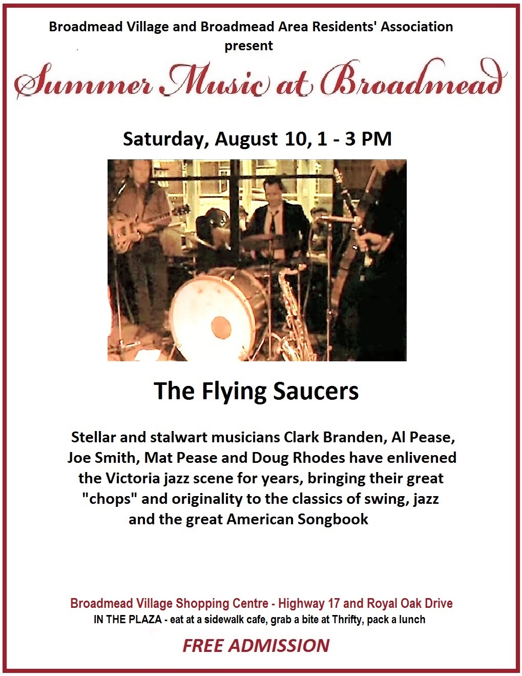 This series of eclectic music in an intimate setting, surrounded by sidewalk cafes, features this Saturday The Flying Saucers - Clark Branden, Al Pease, Joe Smith, Mat Pease and Doug Rhodes - stellar stalwarts of the Victoria jazz scene, bring their chops and originality to the classics of swing, jazz and the great American Songbook.