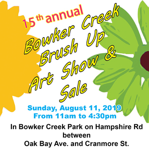 Bowker Creek Brush Up Art Show & Sale: Robert Amos, Peter Baxter, Audry Campsall, Margaret Case, Gen Chandler, Claire Christinel AFCA, Arlene Davey , Joan Easton, Ashley Hamilton, Caroline Hunter , Donna Ion, Susan Leather, Vivian Lockridge, Victor Lotto , Joanie McCorry, Avic Rasmussen, Paul Redchurch, Gera Scott Chandler, Joan Turner , Pam Stonehouse , Erik Thorn, FLO-ELLE WATSON, Graham Thompson, Pat Martin-Bates, Wayne Anaka, Heather-Elayne Day, Suzanne Heron, Helen Jaques, Laurie McAmmond, Tony Mochizaki, Linda Rajotte, Shirley Richardson, Virginia Ronning, Arden Rose, Dallas Segno, Brian Simmons, Jo Vipond