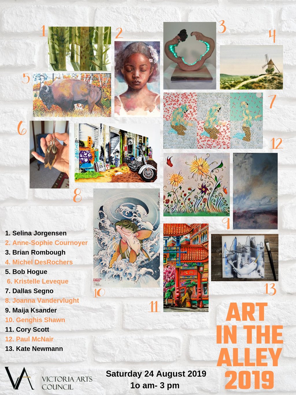 ART IN THE ALLEY 2019: Selina Joergensen, Anne-Sophie Cournoyer, Brian Rombough, Michel Des Rochers, Bob Hogue, Kristelle Leveque, Dallas Segno, Joanna Vandervlught, Maija Ksander, Genghis Shawn, Cory Scott, Paul McNair, Kate Newmann
