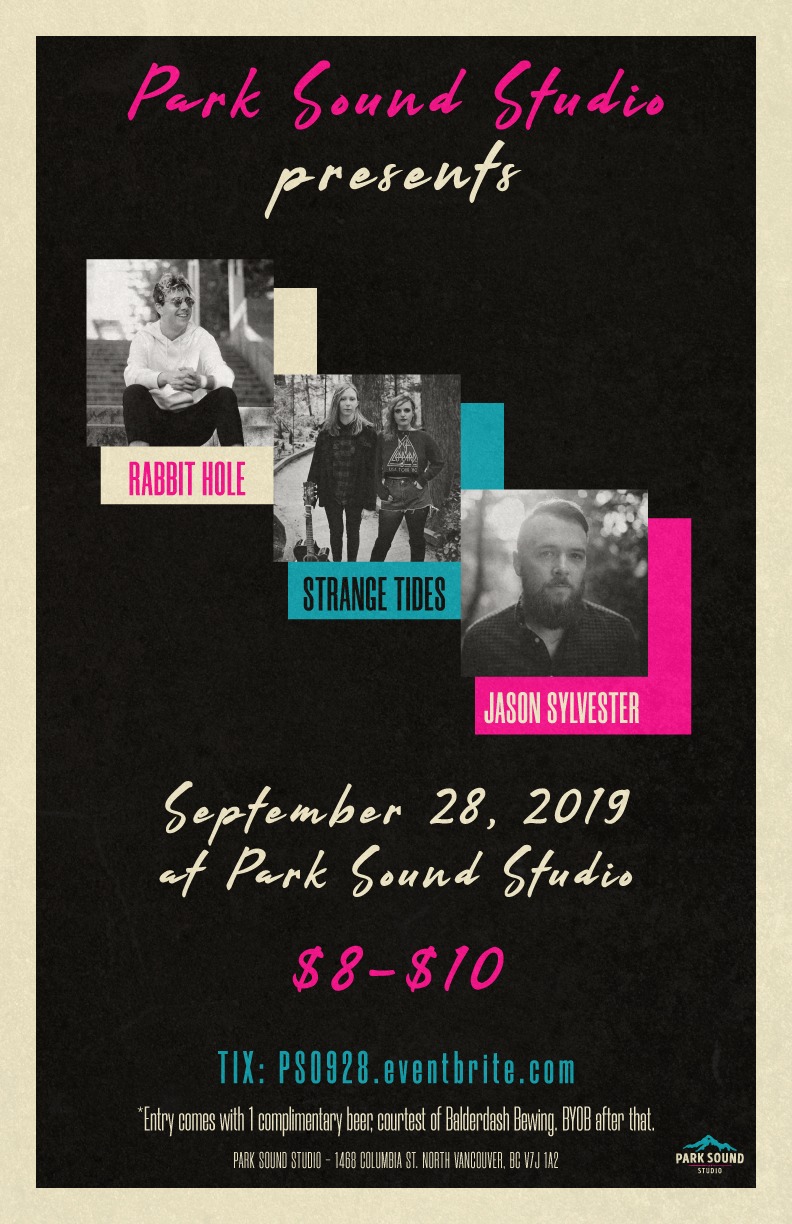 Park Sound Presents is a monthly musical showcase hosted at Park Sound Studio, a recording studio located in North Vancouver. On Saturday, September 28, we're welcoming Rabbit Hole, Strange Tides & Jason Sylvester.