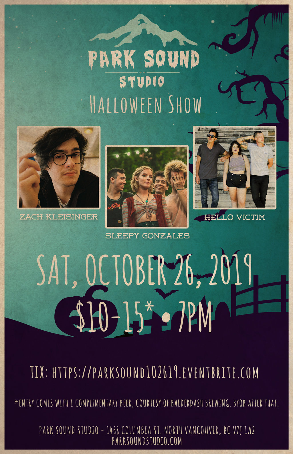 Park Sound Presents is a monthly musical showcase hosted at Park Sound Studio, a recording studio located in North Vancouver. On Saturday, October 26, we're welcoming Sleepy Gonzales, Zach Kleisinger & Hello Victim as part of our annual Halloween Show!