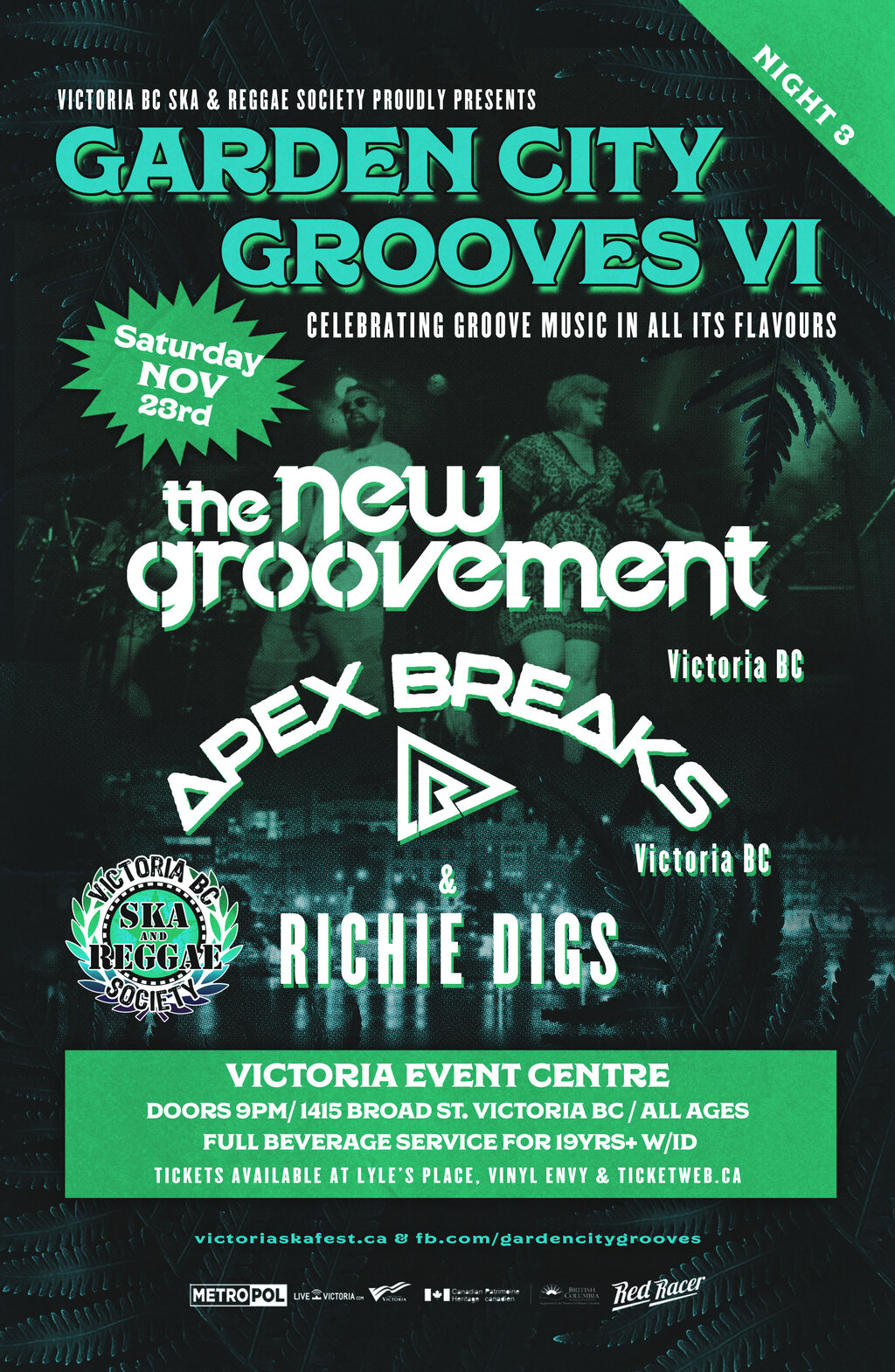 The stage will already be plenty heated up by the time New Groovement gets on it as we've got psychedelic junk-funk colossus APEX BREAKS coming in hard to get things going for this Saturday night get-down. It didn't take long for Apex Breaks to make a name as one of the funkiest and forward-thinking groove bands Victoria has seen in quite some time. Their set at this years Victoria Ska & Reggae Festival opening for Cherry Poppin' Daddies was marked by many as one of the highlights of the festival. The engagement between the band and the audience is almost as captivating as the interplay between the members themselves. Apex Breaks takes the stage determined to play serious funk music while having as much as they possibly can while doing it. Joining the party is guest Richie Digs, one of the city's most knowledgeable and versatile DJ s, who will be working the 1s and 2s, getting the night warmed up and holding it down between sets. Don't miss this Saturday night party. Come help us close down Garden City Grooves VI with a bang!