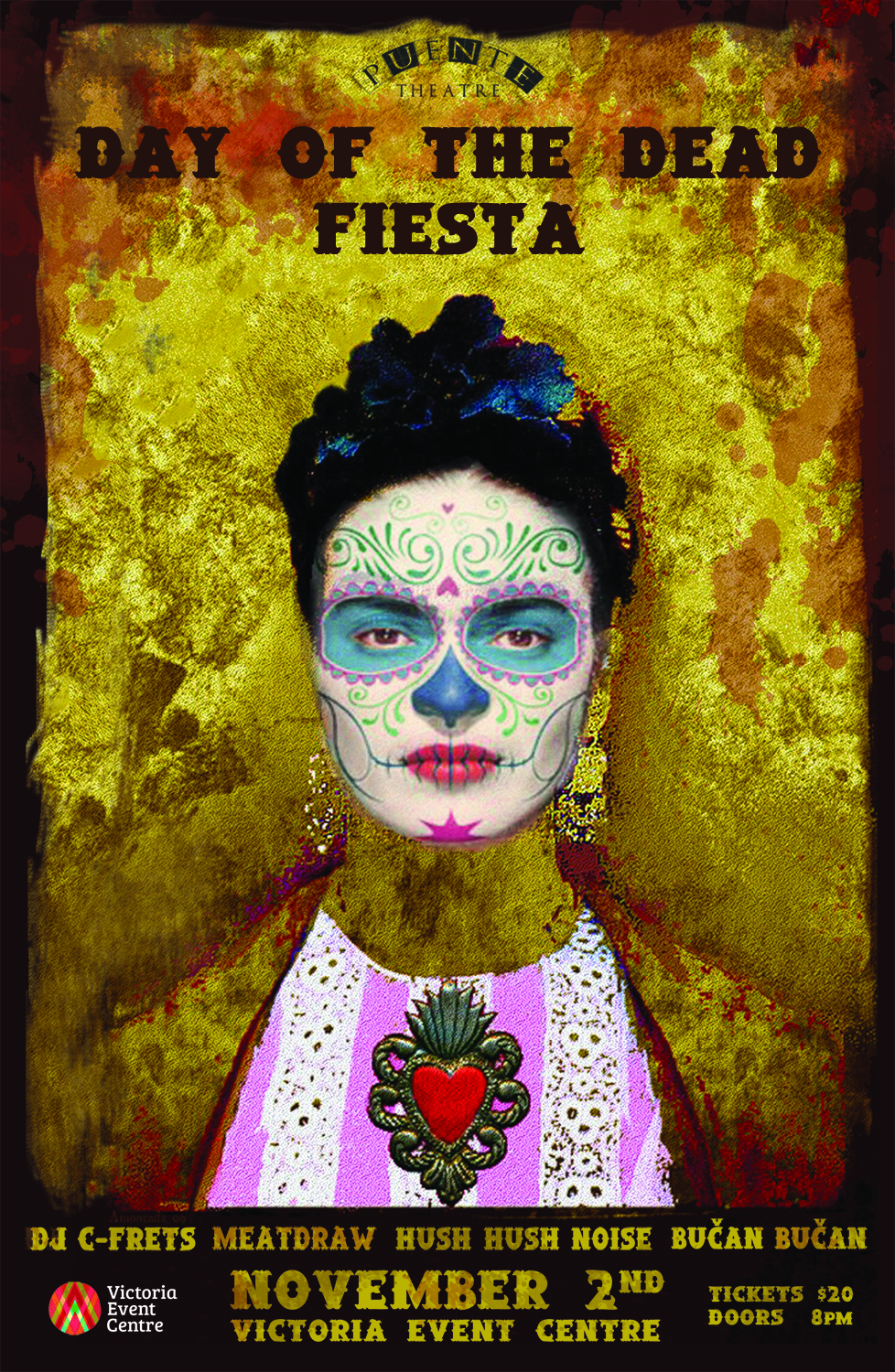 7th Annual DAY OF THE DEAD FIESTA!Compadres: The dead come back to visit only one night a year. This is the night. Let's welcome them in style.FEATURING:DJ. C-FretsMeatdrawHush Hush NoiseBučan BučanSaturday, November 2nd Doors open @ 8 pm Music! Dancing! Cerveza! Catrina face-painting!Costumes = buenoVEC - Victoria Event Centre (1415 Broad Street)Tickets: $20 @ the doorNo minorswww.puentetheatre.caDay of the Dead At first glance, the Mexican custom of El Día de los Muertos — the Day of the Dead — may sound much like Halloween. After all, the celebration traditionally starts at midnight the night of Oct. 31, and the festivities are abundant in images related to death, but the customs have different origins, and their attitudes toward death are different. In the typical Halloween festivities, death is something to be feared, but in El Día de los Muertos, death — or at least the memories of those who have died — is something to be celebrated.El Día de los Muertos, which continues until Nov. 2, has become one of the biggest and most important holidays in Mexico. Its origins are distinctly Mexican: During the time of the Aztecs, a month-long summer celebration was overseen by the goddess Mictecacihuatl, the Lady of the Dead. After the Aztecs were conquered by Spain, and Catholicism became the dominant religion, the customs became intertwined with the Christian commemoration of All Saints' Day on November 1st and All Souls' Day on November 2nd.One of the most common customs is the making of elaborate altars to welcome departed spirits home. Vigils are held, and families go to cemeteries to fix up the graves of their departed relatives using sugar skulls, hundreds of marigolds, pan de muerto (bread of the dead), and the favorite foods and beverages of their departed loved ones. The Day of the Dead is a time to honour all those who are no longer with us, but who come back on November 2nd so we can all celebrate life and the natural order of things together.Accessibility:* The Victoria Event Centre does not have an operational elevator, and there is one long flight of stairs at the venue entrance. If you would like to attend the event but require assistance with accessing the space, please contact them at [email protected] and VEC staff will do their best to accommodate.* More detailed venue accessibility info is available at https://victoriaeventcentre.ca/attendees/accessibility/* Washrooms are for all genders.