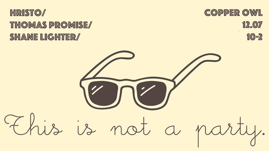 In the tradition of Magritte, Fugazi and pretentious teenagers everywhere, it's This Is Not A Party! Featuring house music that's categorically not in a home, disco without a disc in sight, and techno that can only be described as techyes.