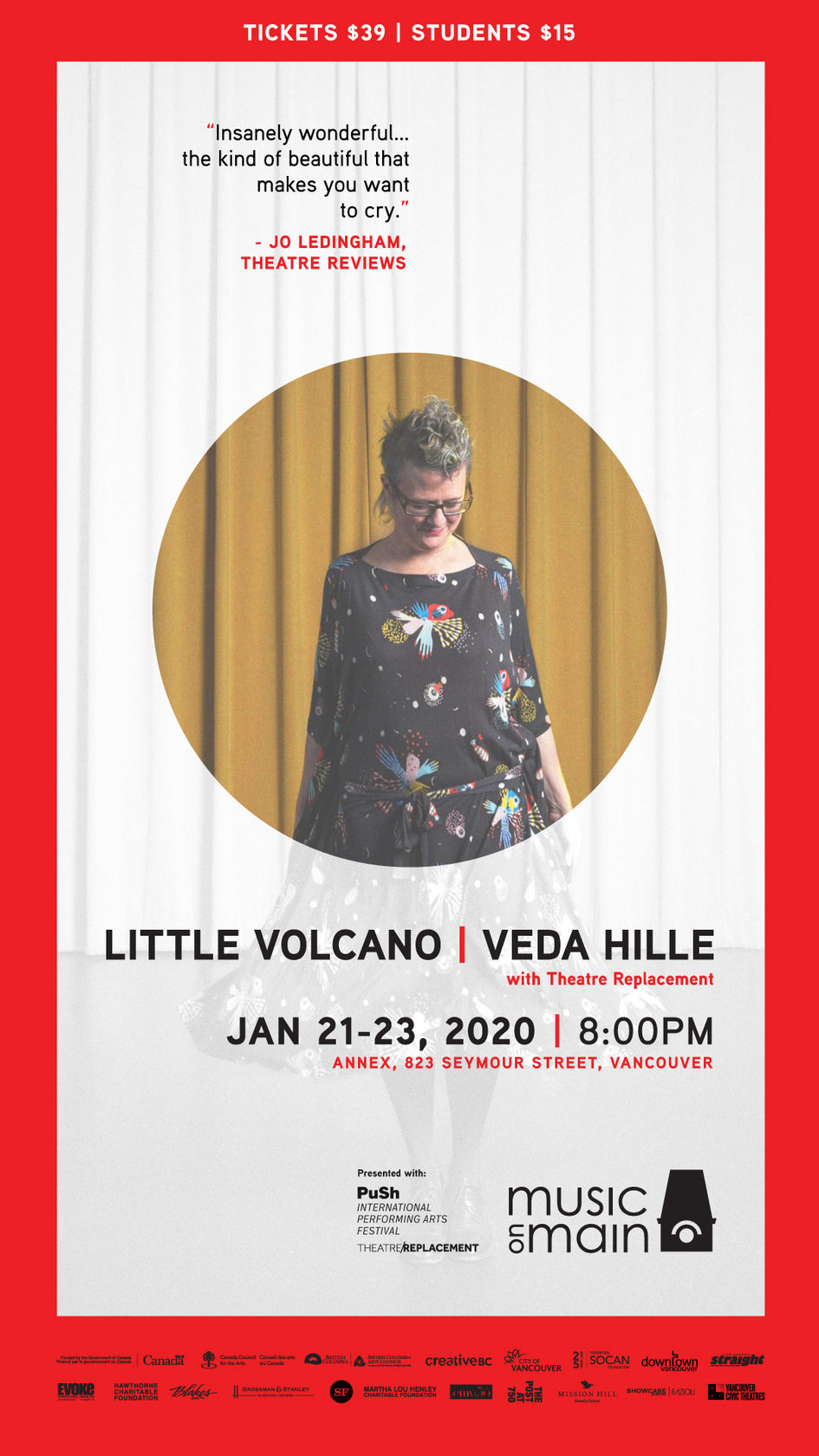 Pianist and songwriter Veda Hille combines music and storytelling in this intensely personal performance. Drawing from works by J.S. Bach, as well as Veda’s own compositions, Little Volcano offers a glimpse into the life of one of Vancouver’s most beloved musical artists.